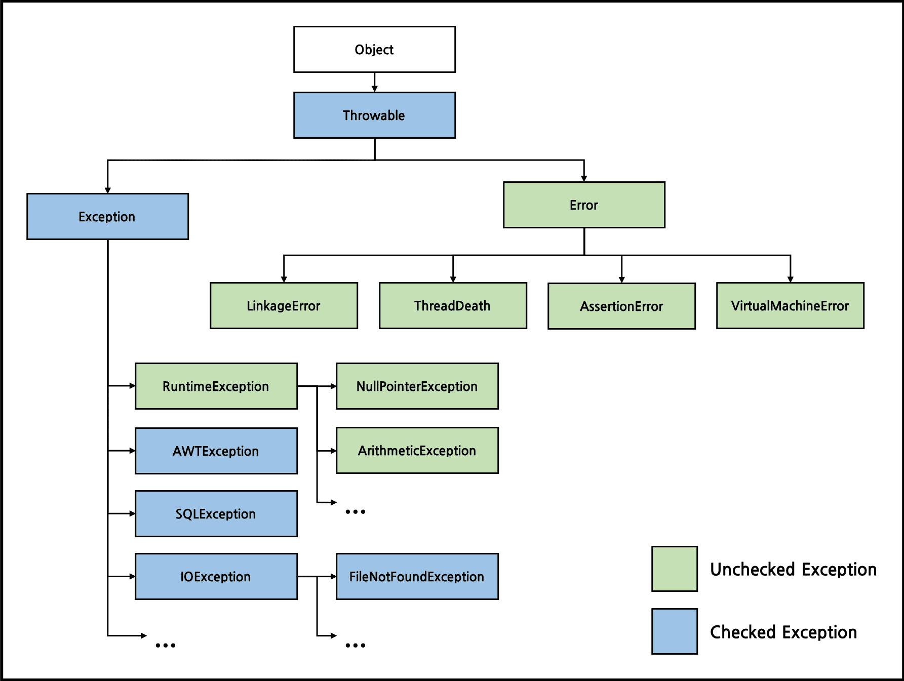 첫째는 java.lang.Error 클래스의 서브클래스들이다. 에러는 시스템에 뭔가 비정상적인 상황이 발생했을 경우에 사용된다. 그래서 주로 자바 VM에서 발생시키는 것이고 애플리케이션 코드에서 잡으려고 하면 안된다. 시스템 레벨에서 특별한 작업을 하는 게 아니라면 애플리케이션에서는 이런 에러에 대한 처리는 신경 쓰지 않아도 된다.